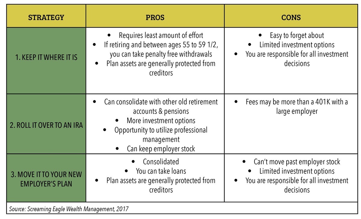 • Weigh new options for your 401(k) and pension carefully–these may be the largest assets you own.